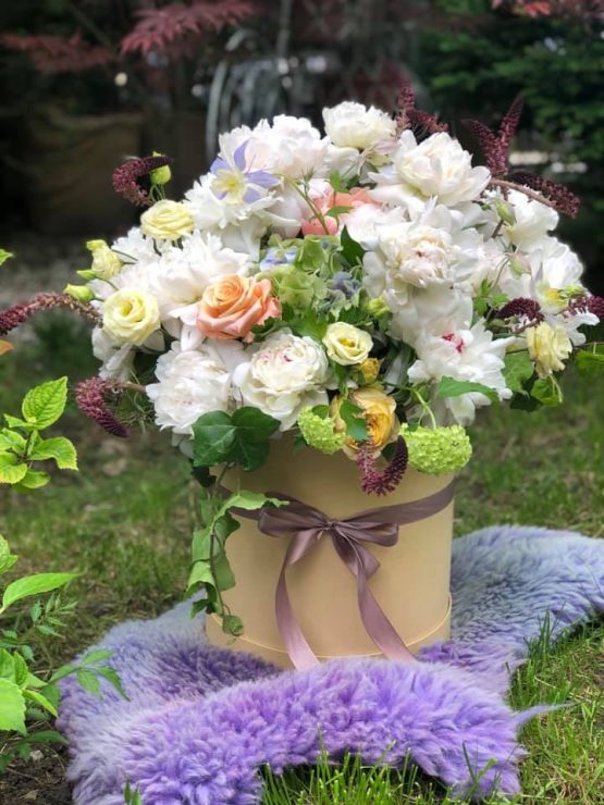 Un aranjament floral in stilul PATCHOULI, intr-o cutie ivoire, de dimensiune medie.